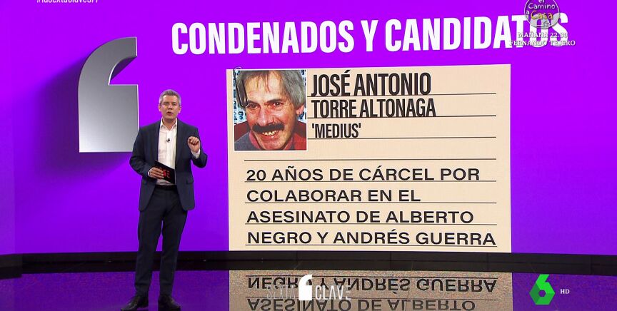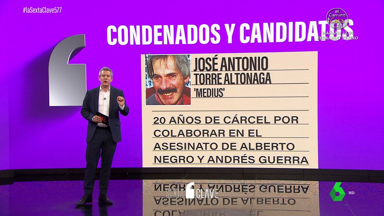 De los 44 candidatos, hay siete etarras que Bildu presenta a las elecciones tras cumplir una condena por asesinato. Primero: José Antonio Torre Altonaga, alias "Medius". En 1981 tuvo una condena de 20 años de prisión por su colaboración en los asesinatos de Alberto Negro Viguera y Andrés Guerra Pereda. 32 años después se presenta como suplente número dos de la lista a la alcaldía de Munguía en Vizcaya.