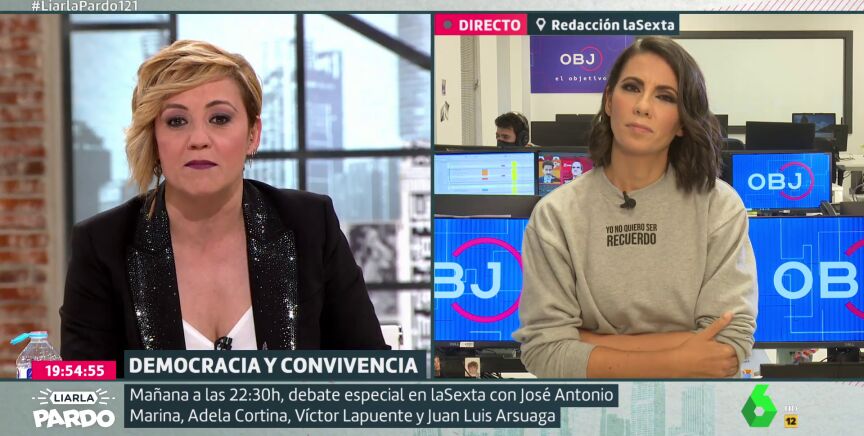 Cristina Pardo ha preguntado a Ana Pastor, que iba a moderarlo, si cree que volverá a moderar otro debate ante este clima de tensión política. "Sinceramente, no lo sé", ha respondido la presentadora, que no obstante ha defendido que "los debates siempre son buenos" y que "frente al odio la palabra es el mejor recurso".