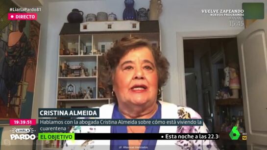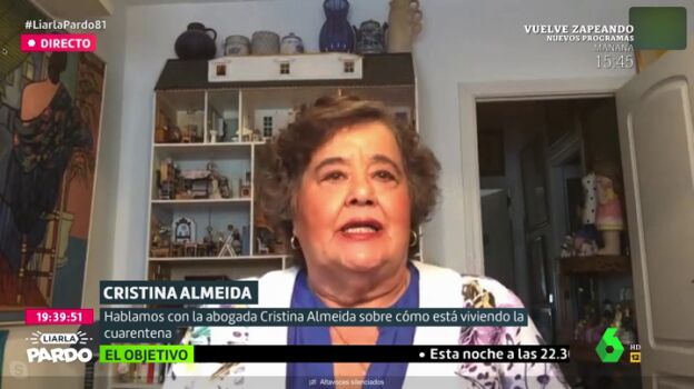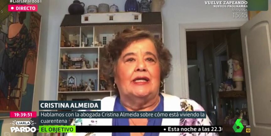 Cristina Almeida ha criticado en Liarla Pardo la actitud de la oposición en la crisis del coronavirus. "Hay más deseo de cargarse al Gobierno que de cargarse al coronavirus. Cuando hablaron de los Pactos de La Moncloa pensaba que mejor que no los mencionaran porque de La Moncloa lo que puede tener es el edificio, pero del espíritu no tiene nada que ver", ha manifestado.