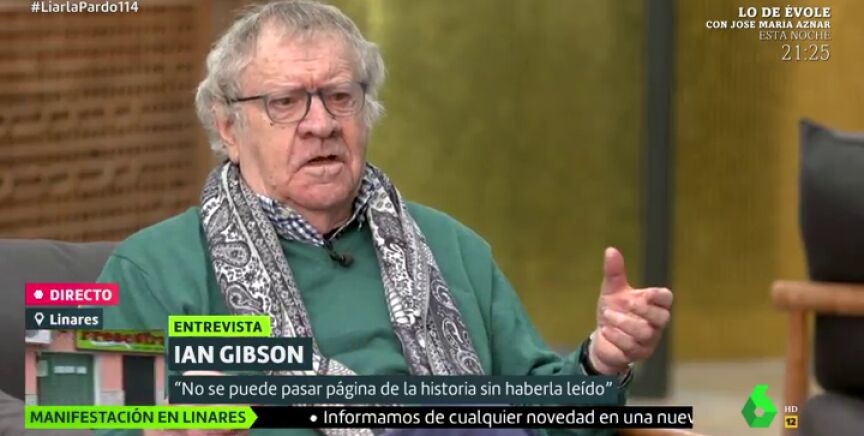 Cristina Pardo charla con el hispanista Ian Gibson tras la publicación de su última obra, 'Hacia la República Federal Ibérica'. Se muestra muy crítico con la abstención del PP en la decisión de retirar la estatua de Franco en Melilla, algo que le parece "lamentable".