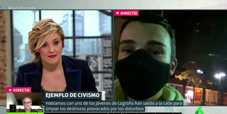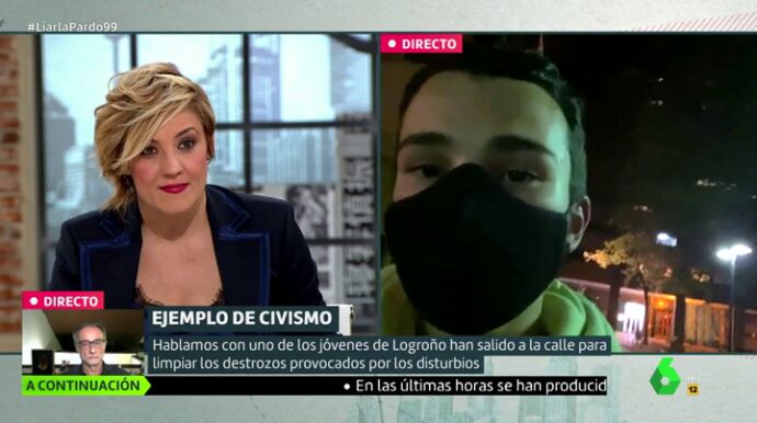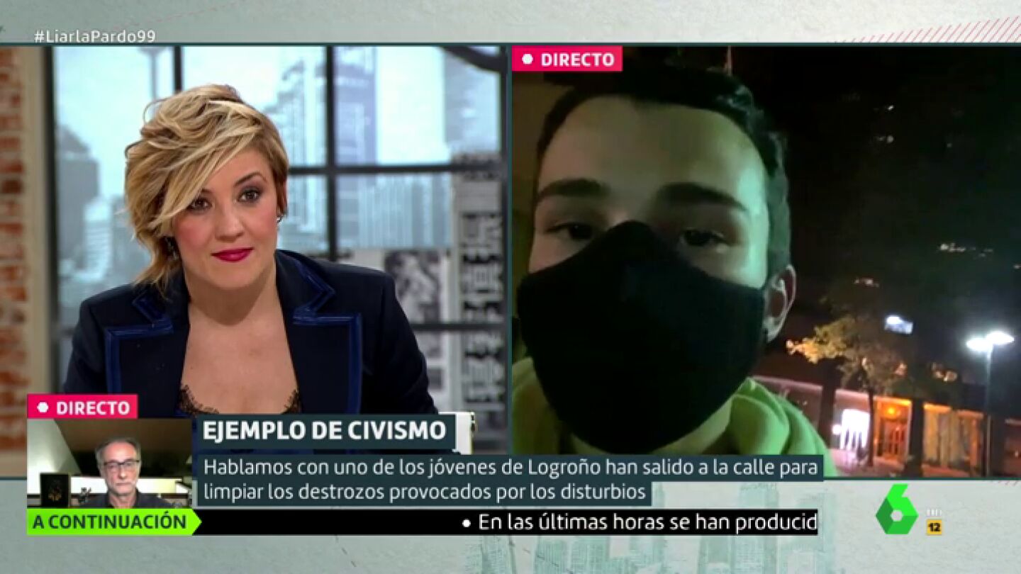 Cristina Pardo ha hablado con Fernando Bastida, uno de los jóvenes de Logroño que han salido a la calle para limpiar los destrozos provocados por los disturbios de este sábado. El menor ha expresado que sintieron un "vacío enorme" cuando vieron cómo dejaron las calles, por lo que decidieron actuar.