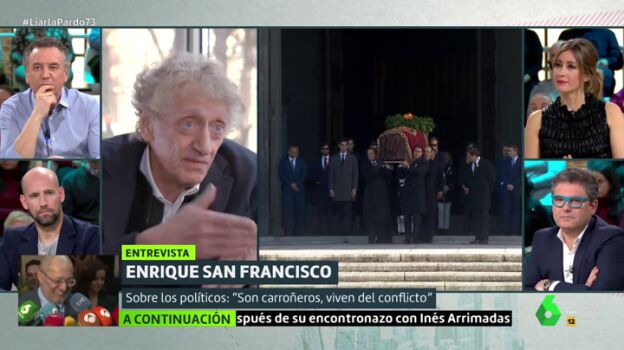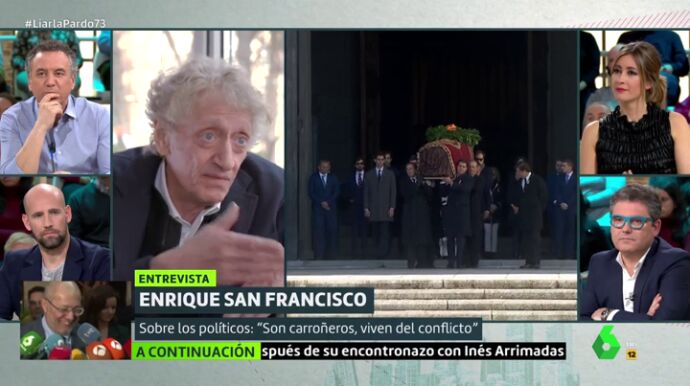 Enrique San Francisco se ha mostrado especialmente duro, en la entrevista concedida a Liarla Pardo, contra la clase política española, a la que acusa en su mayoría de "ser carroñera" y buscar únicamente el poder: "Oírles hablar con esa falta de de respeto y despotismo me parece terrible".