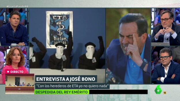 José Bono también ha hablado sobre las informaciones que apuntan a que Zapatero habría llegado a un pacto cuando era presidente del Gobierno con ETA para crear un órgano común en País Vasco y Navarra. Bono niega tajantemente dicha afirmación: "No solamente no me consta si no que lo que me consta de Zapatero es que cuando se negoció fue para acabar con ETA".
