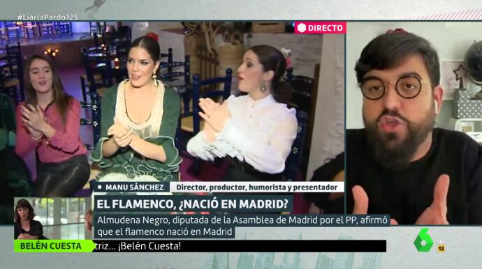Con todo, indica que no hay antropólogo musical que sepa decir con certeza dónde nació el flamenco, pero sí se sabe que la cuna del flamenco es Andalucía y que es "algo indiscutible". Por eso, tacha las afirmaciones de la diputada de "ridículas" y pone un ejemplo: "El plato típico de Madrid son los bocatas de calamares y eso está muy lejos de pensar que el calamar es madrileño", dice en tono de broma el presentador.