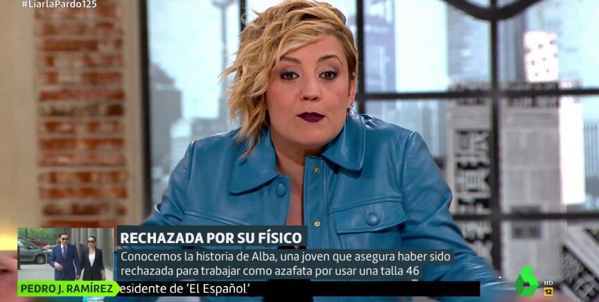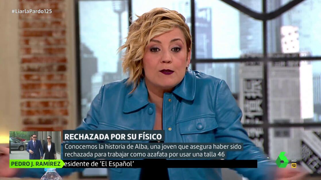 La historia de Alba, una joven que fue rechazada como azafata en Ifema por usar una talla 46, ha enfadado a Cristina Pardo quien, tras charlar con ella, ha querido lanzar un alegato en favor de la diversidad en los cuerpos. Poniéndose de ejemplo, la presentadora de Liarla Pardo ha criticado "el prototipo que se nos quiere meter como si fuera la perfección personificada, pues no. Cada uno es como es".