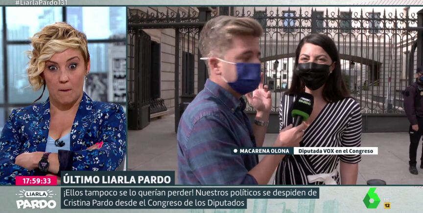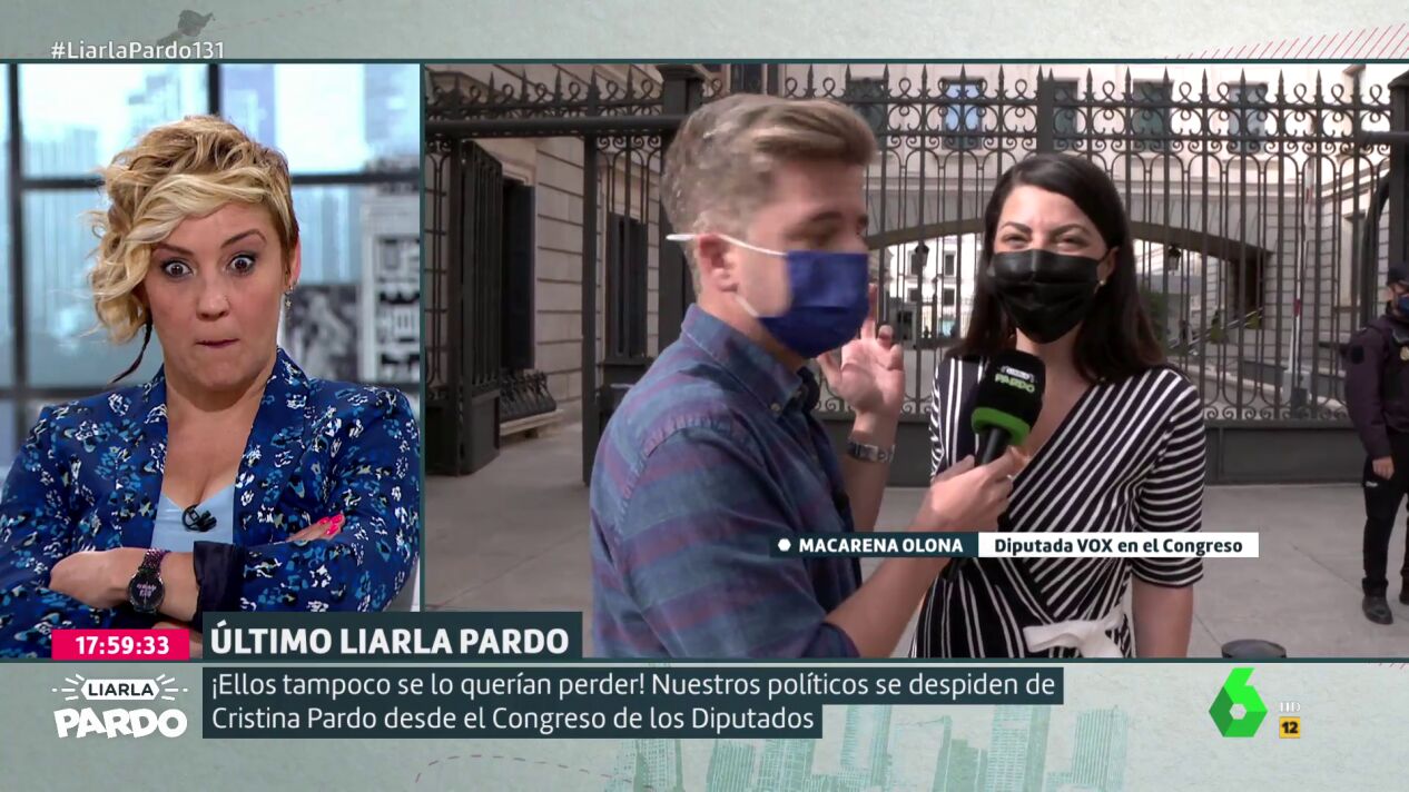 En el último programa de Liarla Pardo, Luis Troya se ha desplazado hasta las puertas del Congreso de los Diputados para que los políticos manden un mensaje al programa y a Cristina Pardo. El diputado más longevo del Congreso, el socialista Agustín Zamarrón, realiza casi un epitafio en la despedida de Pardo mientras que Macarena Olona (Vox) manda un mensaje a la periodista en su nuevo reto profesional. Un mensaje que sorprende mucho a Cristina Pardo como puedes ver en el vídeo principal de esta noticia.