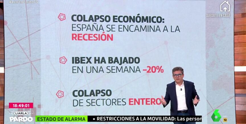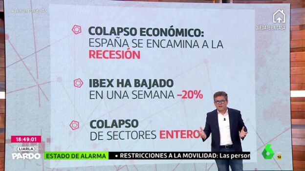 Vidal ha expuesto en el programa la serie de factores que podrían perjudicar seriamente la economía española, y, por tanto, el bolsillo de los ciudadanos. A destacar: que España y los países europeos se encaminan a una nueva recesión, que se ha producido un colapso de sectores enteros por la paralización de la producción a razón de la epidemia y que el Ibex ha bajado en una semana hasta el 20%.