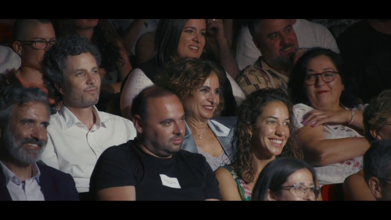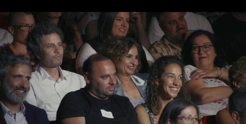 María Jesús Montero es una de las 2.000 personas que asisten al espectáculo conjunto de Manu Sánchez y Jordi Évole en este teatro de Sevilla. El cómico se declara de izquierdas y hace un chiste que provoca la risa de la vicepresidenta primera del Gobierno.
