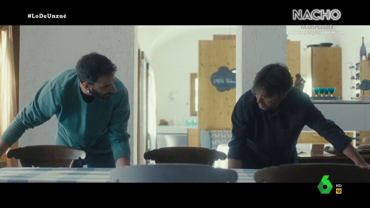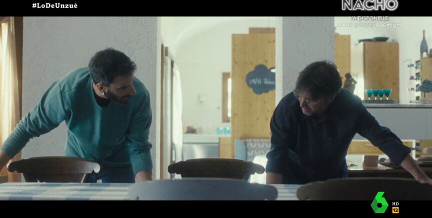 "Mira, que tienes una arruguilla ahí", apunta el humorista y actor mientras ve cómo Évole termina de poner el mantel. "Ya tío, yo también tengo ese TOC. Lo tengo con el mantel y con la cama", confiesa, por su parte, el periodista. Mientras, Juan Carlos Unzúe conversa con su hijo en una videollamada.