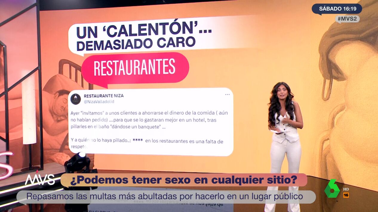 Después de que hayan pillado a dos pasajeros manteniendo relaciones sexuales en el baño de un avión, María Lamela explica en el plató de Más Vale Sábado si, realmente, se puede tener sexo en lugares públicos. "El único artículo que habla de esto es el que se centra en el delito de exhibicionismo y provocación sexual", explica la periodista, que detalla que, entonces, "sería delito si se hace delante de personas menores o con discapacidad".