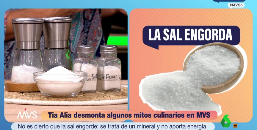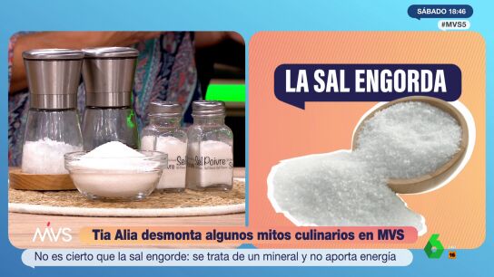 "La sal no tiene calorías porque es un mineral, aunque hace que nuestro organismo retenga líquidos", aclara la cocinera Carmen 'Tía Alia' en el plató del programa Más Vale Sábado, donde se ha encargado de desmontar algunos de los bulos más recurrentes sobre la alimentación.