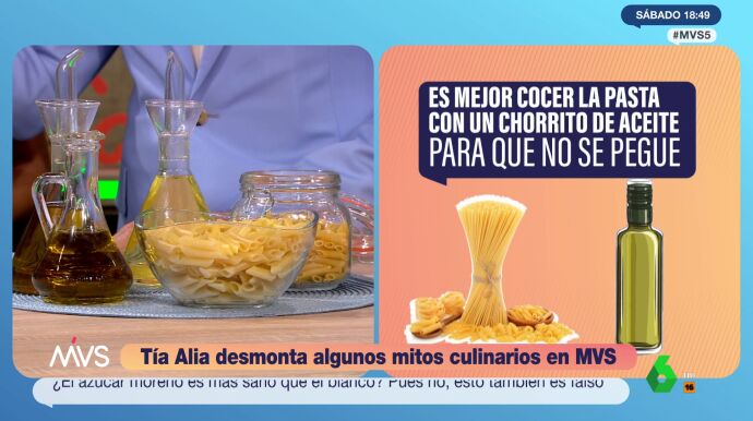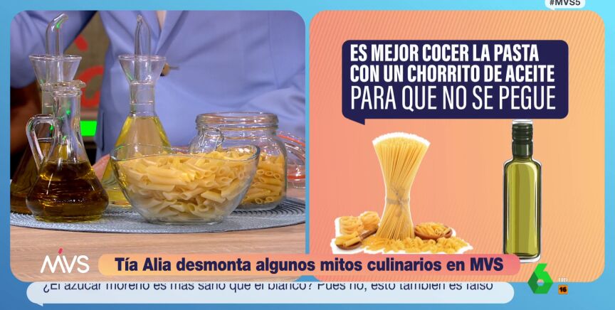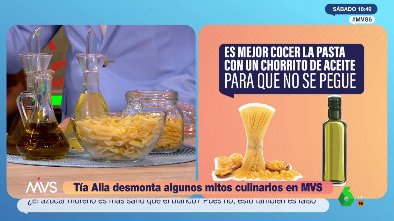 ¿Es recomendable cocer la pasta agregando un chorrito de aceite en el agua para que no se pegue? 'Tía Alia' se muestra contundente y afirma que esa creencia es "falsa". Reconoce, no obstante, que ella misma la ha hecho "durante muchos años".
