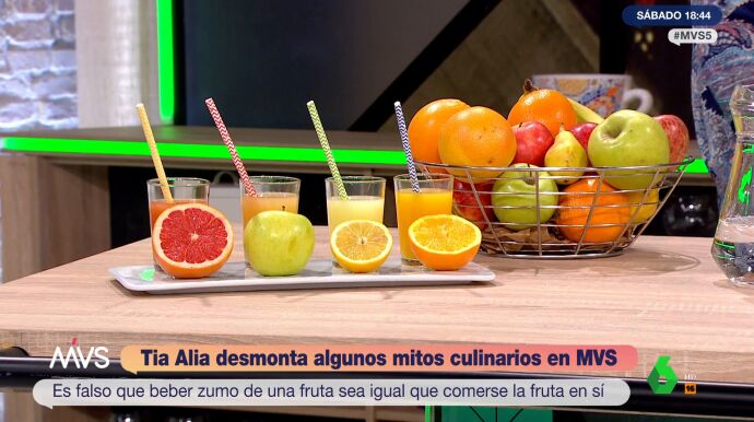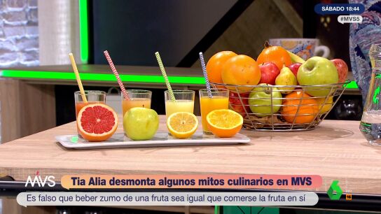 ¿Tomar la fruta entera es tan sano como hacerlo en zumos? ¿La fruta engorda si se toma con las comidas? La cocinera Carmen 'Tía Alia' desmonta los mitos más extendidos sobre alimentación en Más Vale Sábado.