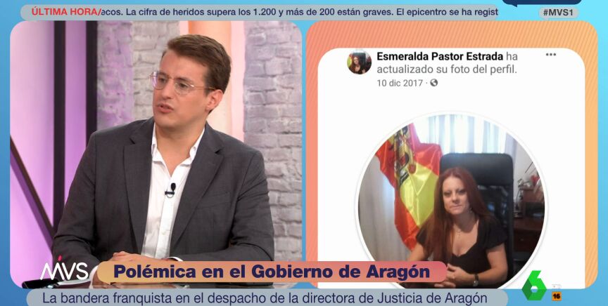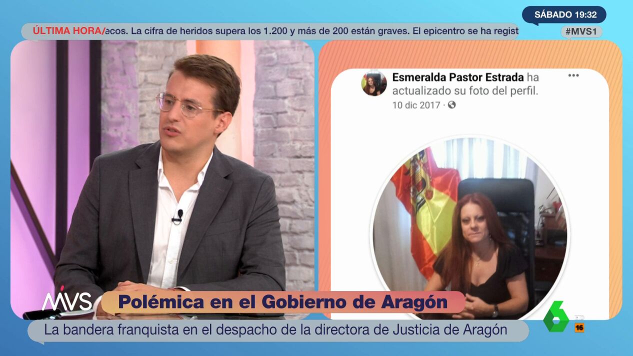 La fotografía de Esmeralda Pastor, directora general de Justicia del Gobierno de Aragón perteneciente a Vox, con una bandera franquista ha generado unanimidad en el plató de Más Vale Sábado. El diputado de Sumar Jorge Pueyo reconoce que le duele "muchísimo" ver esta imagen.