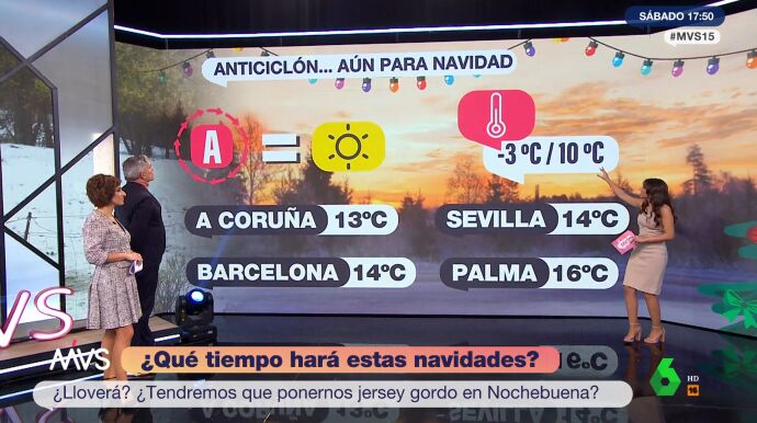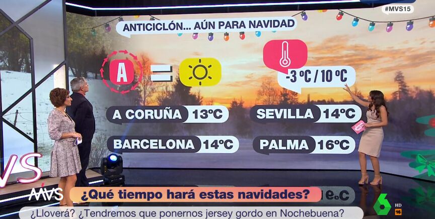 Marta Barbolla, meteoróloga de laSexta, trae buenas noticias sobre el tiempo de las inminentes fiestas navideñas: "Al anticiclón que tenemos ahora mismo parece que le apetece quedarse unos cuantos días y nos va a dar una tregua de cara a las Navidades".