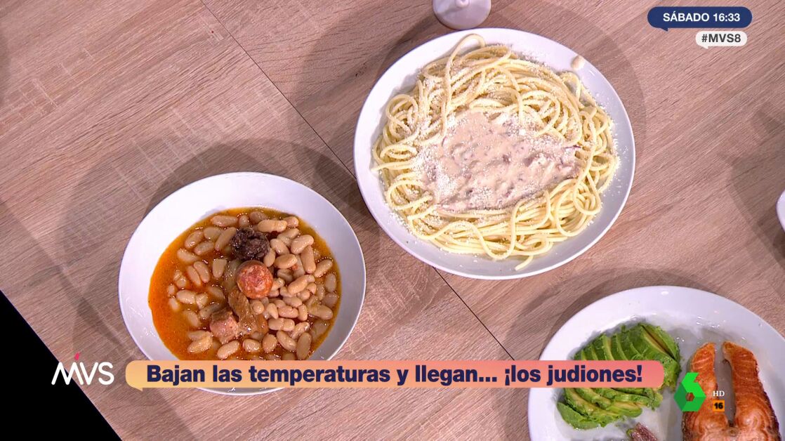 La nutricionista visita el plató de Más Vale Sábado y pone a prueba el ojo crítico de Boris Izaguirre y Adela González, a los que hace elegir entre un plato de fabada o uno de pasta carbonara. ¿Cuál es peor para el colesterol?