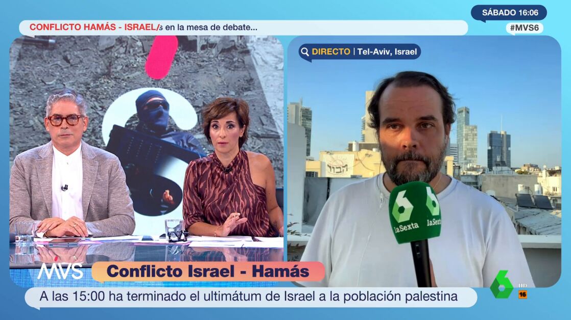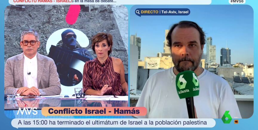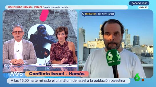Amador Guallar, enviado especial de laSexta en Israel, conecta en directo con Más Vale Sábado segundos después de que un cohete haya atravesado el cielo de Tel Aviv: "Estoy viendo la estela y cómo la cúpula de hierro lo ha interceptado". "Ha venido acompañado de una tremenda explosión", describe mirando hacia el cielo, e informa de que, por el momento, "es solamente uno, pero seguramente vendrán dos o tres más porque es el método". Así que, intenta hacer la conexión "todo lo rápido y breve posible".