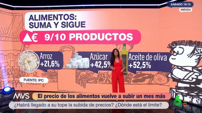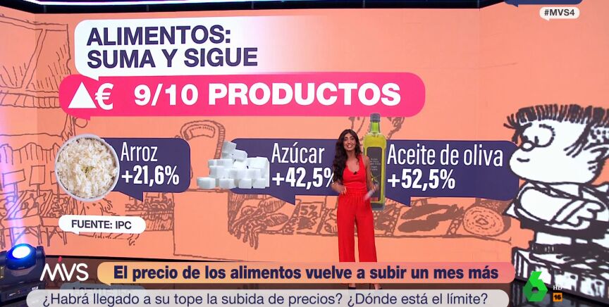 Un dato que refuerza María Lamela con su análisis, en el que informa sobre los alimentos que más han subido, como el "arroz", cuyo precio ha incrementado en un 21,6%; el "azúcar", que cuesta 42,5% más; o el aceite de olivaque ha subido un 52,5% su precio.