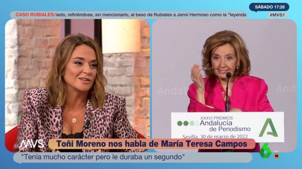 Toñi Moreno ha visitado el plató de Más Vale Sábado, el nuevo programa de laSexta presentado por Adela González y Boris Izaguirre. La presentadora andaluza ha recordado con cariño a María Teresa Campos. "Me trajo a Madrid después de verme durante unas vacaciones que pasó en Estepona. Yo hice un máster con ella y aún mis amigas me piden que les cuente anécdotas", ha destacado sobre la comunicadora recientemente fallecida.