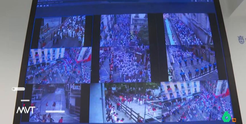 Más Vale Tarde, gracias a la reportera de La Sexta, María Lamela, ha podido seguir el sexto encierro de San Fermín desde el centro de pantallas de una de las comisarias de la Policía Municipal, desde donde se monitorizan no sólo los encierros, sino todas las fiestas con 1.000 cámaras.