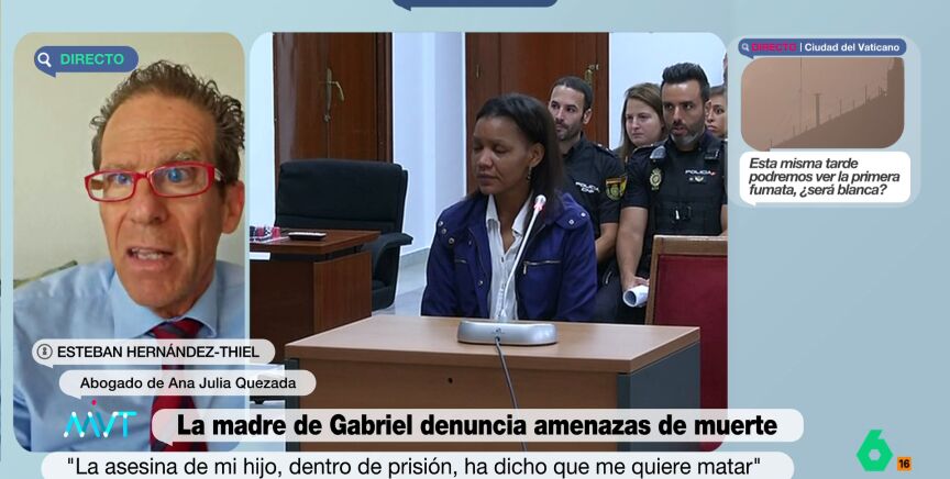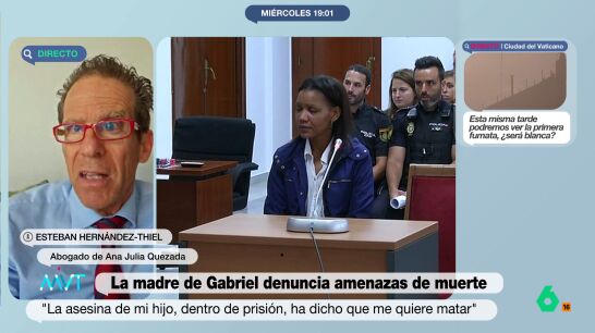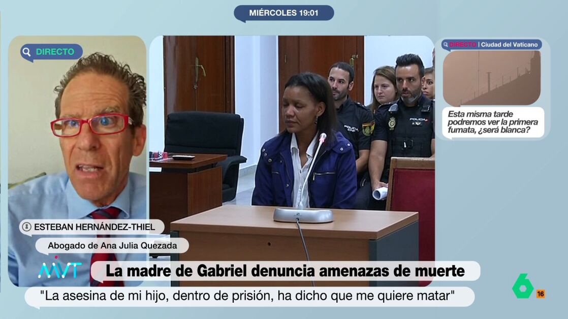 La madre de Gabriel, Patricia Ramírez, ha denunciado que la asesina de su hijo quiere matarla. Esteban Hernández Thiel, abogado de Ana Julia Quezada durante el juicio por el asesinato del pequeño, valora esta denuncia en Más Vale Tarde.