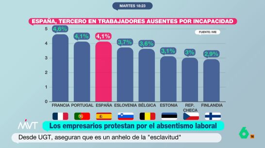 Calcerrada expone las cifras del absentismo laboral. "En cuanto al 100% de los trabajadores, vemos que el absentismo ha ido creciendo a lo largo de los últimos años", indica. Mientras que en el 2013 era de un 3,8% en 2025 está en el 5,2%. A nivel internacional, "España estamos terceros según los datos del IVIE", indica el periodista, por detrás de Francia y Portugal.