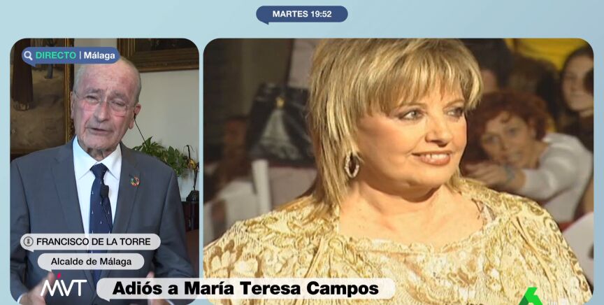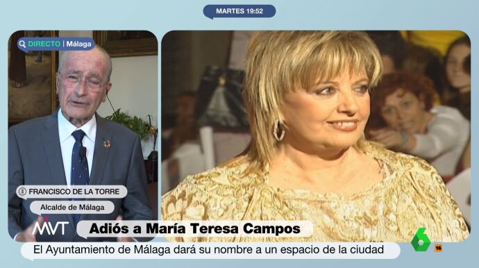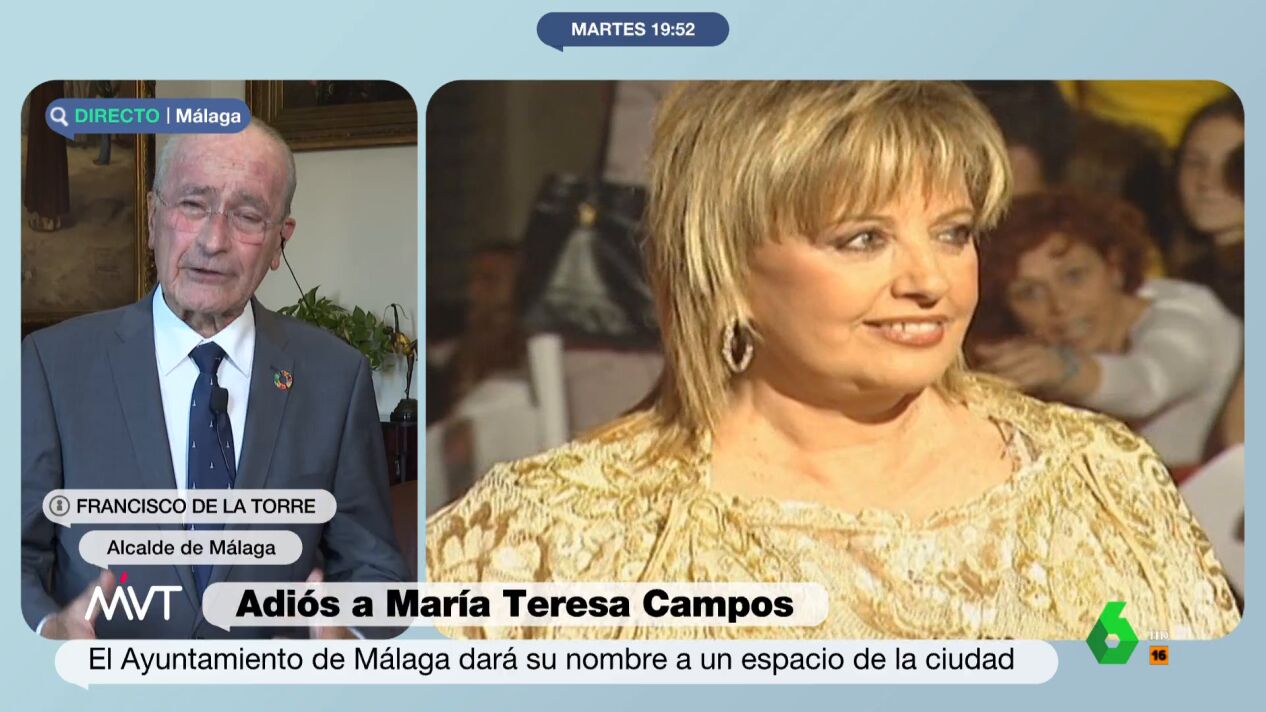 El alcalde de Málaga, el 'popular' Francisco de la Torre, ha confirmado este martes en Más Vale Tarde que el Ayuntamiento pondrá el nombre de la periodista María Teresa Campos a un espacio público de la ciudad. El regidor ha elogiado a la presentadora que falleció la madrugada del martes, y ha asegurado que "Málaga sigue en deuda con ella". Aunque nació en Madrid, Campos es Hija Adoptiva de la Provincia de Málaga 2017, ciudad que considera como propia.
