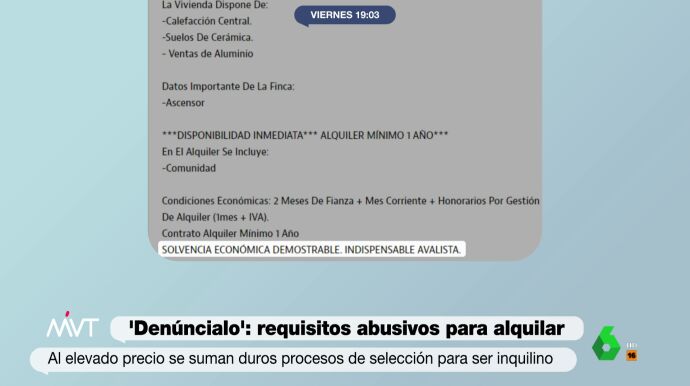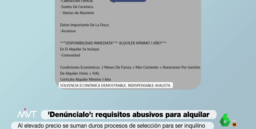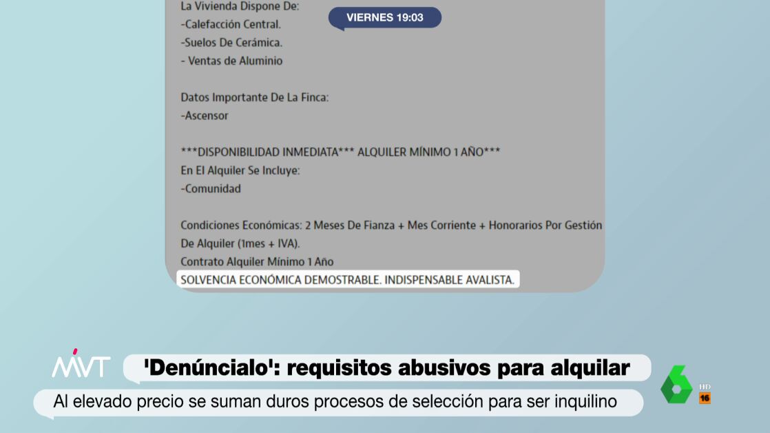 En nuestra sección 'Denúncialo', hablamos hoy de conseguir un alquiler con condiciones dignas en este país. Porque ya no es solo que cada vez sean más escasos y caros; ahora, además, hay que enfrentarse a un complejo proceso de selección para conseguir una vivienda donde te pueden pedir, entre otras cosas, el pago anticipado de suministros, contratos estables, aval bancario. En definitiva, ya te pueden pedir de todo para poder entrar de alquiler en cualquier piso.