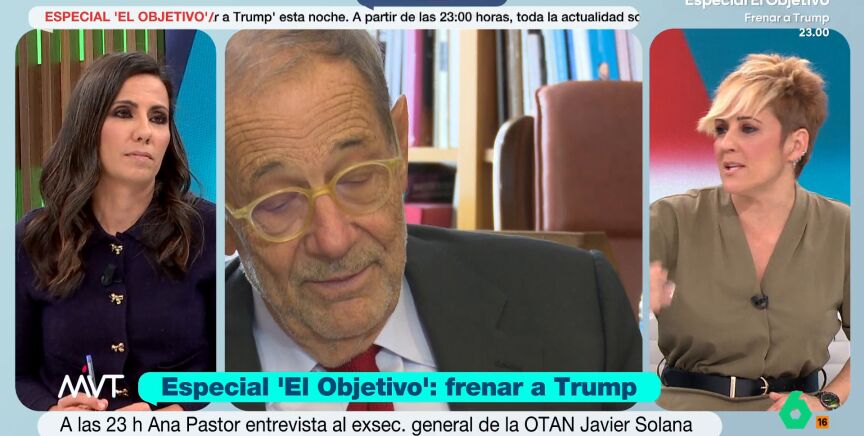 "Esta noche se lo vamos a preguntar", adelanta la periodista. Pastor indica que, "en el contexto que estamos viviendo ahora, él ha estado sentado Lariyani hablando del tema de las armas nucleares". La periodista considera que Solana tendrá una reflexión "interesante" sobre las amenazas de Donald Trump a la OTAN ya que "ahora mismo la OTAN está más debilitada por quién está intentando debilitarla", añade.