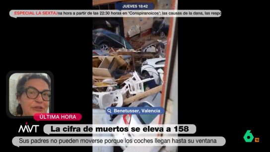 Las riadas causadas por la DANA han provocado que muchas calles hayan quedado bloqueadas por los coches arrastrados por la fuertes corrientes de agua. Ejemplo de ello es la casa de los padres de Mar Pastor que, debido al muro de coches que tapona la puerta de su domicilio, no pueden salir. Sus padres, que viven en Benetússer, tienen 80 años y, además, su padre tiene movilidad reducida. Por suerte, su hermano ha podido acceder al domicilio para comprobar que se encuentran bien.
