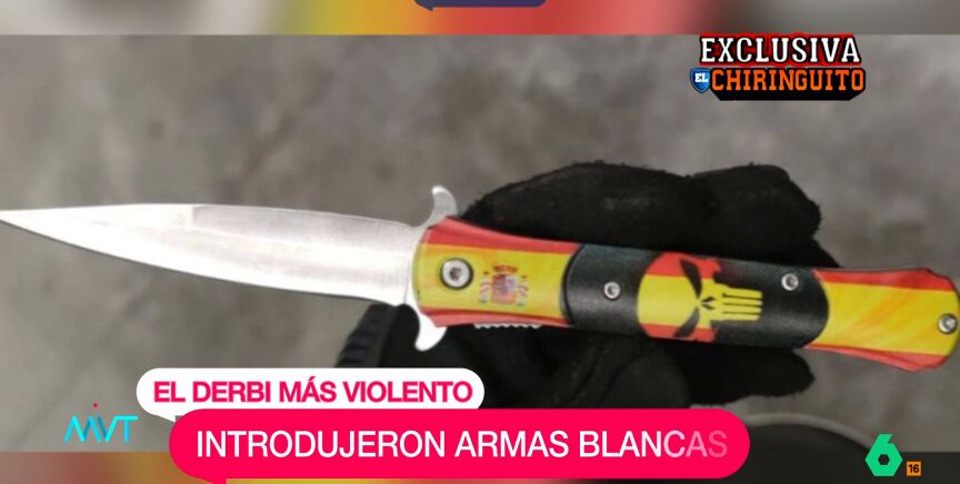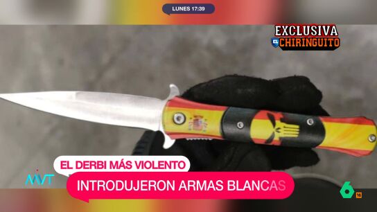 'El Chiringuito' desvela el arma blanca intervenida a uno de los identificados durante el partido entre Atlético y Real Madrid en el estadio Metropolitano. Uno de los radicales ha sido identificado y no podrá volver a entrar al estadio.
