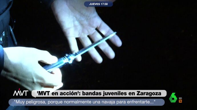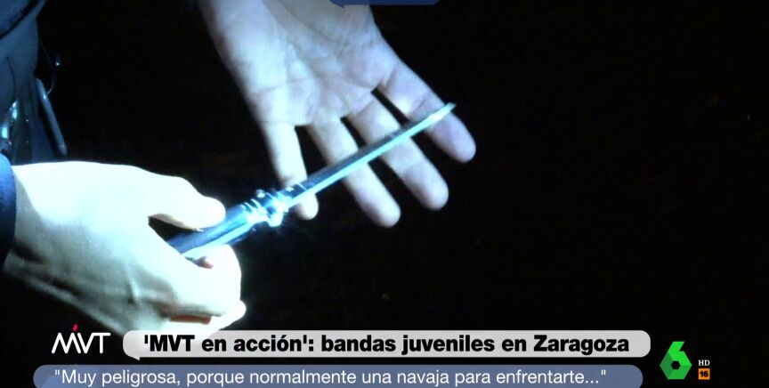 Así, tras interceptar a dos jóvenes que reconocen haber tenido algún problema con la Policía en el pasado, la policía da con varias armas escondidas en un arbusto que muestra al equipo de 'MTV en acción', encabezado por Manu Marlasca. "Se trata de una navaja semi automática. Habitualmente, cada ciertas semanas, la banda rival viene aquí y esto lo tienen para defenderse".