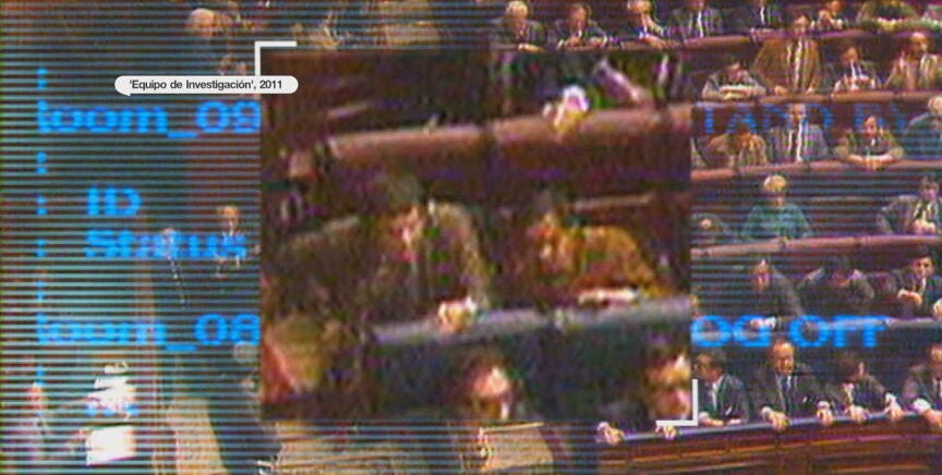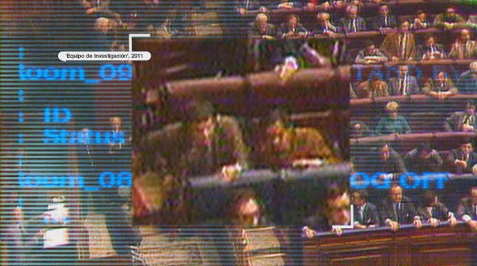 Unos audios en los que se escucha lo siguiente: "La Guardia Civil entra en estos momentos en el Congreso de los Diputados. Hay un teniente coronel que con una pistola sube hacia la tribuna. En estos momentos apunta. Es un guardia civil. Está apuntando con la pistola. Entran más policías, entran más policías. Está apuntando al presidente del Congreso de los Diputados con la pistola. Y vemos cómo, cómo... Cuidado la policía". Tras esta narración, de fondo, se escucha: "¡Al suelo todo el mundo!".