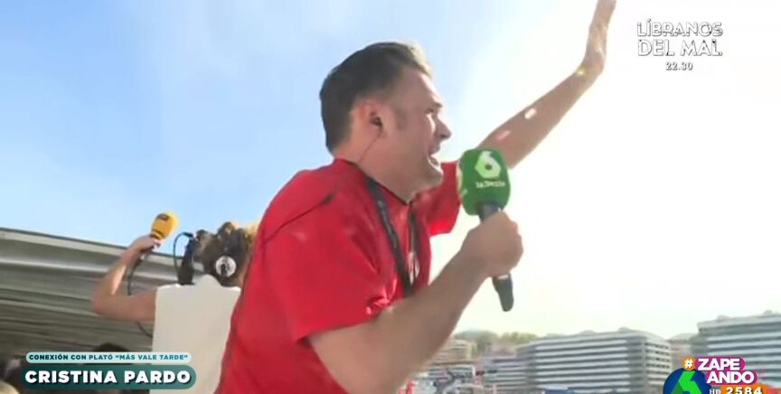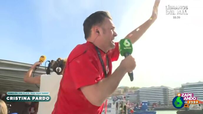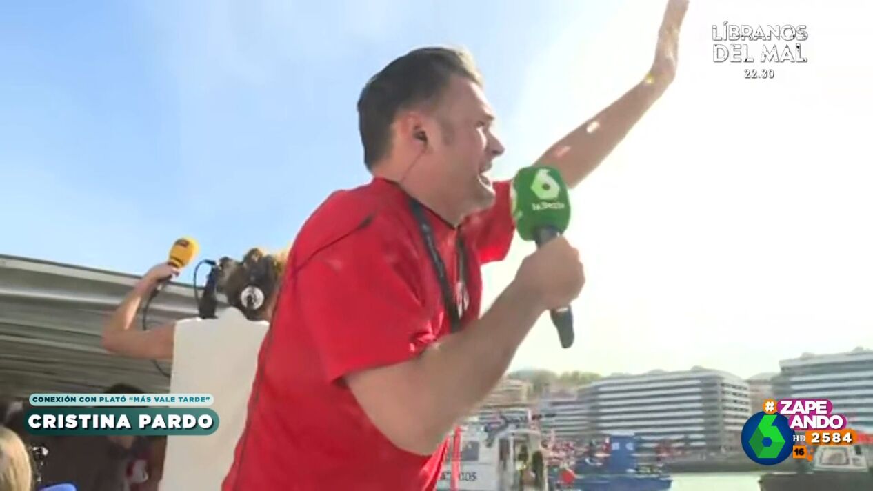 Zapeando y Cristina Pardo conectan con Iñaki López para conocer cómo le va en el barco de la prensa que acompaña a la gabarra del Athletic Club. En este vídeo, el presentador, de lo más eufórico, deja momentos de lo más divertido.