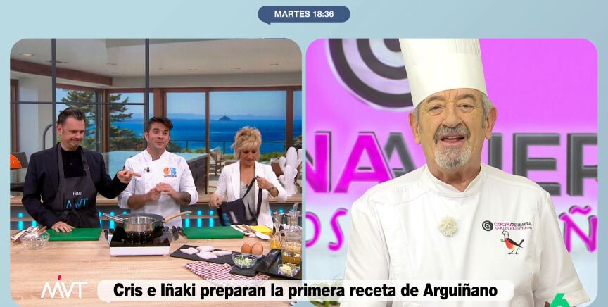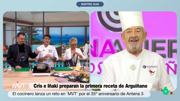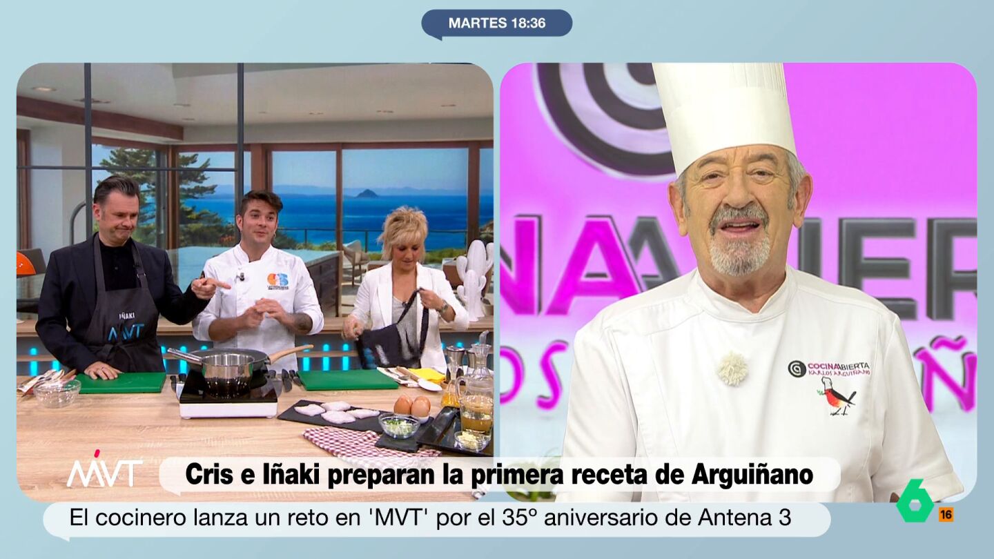 Antena 3 cumple 35 años y, para celebrarlo, las clases de cocina de Cristina Pardo e Iñaki López con el chef Carlos Maldonado afrontan un reto del mismísimo Karlos Arguiñano: replicar el primer plato que cocinó al llegar a la cadena en 2010, una merluza en salsa verde con huevo poché.