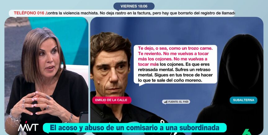 El diario 'El País' ha publicado este viernes grabaciones de la investigación al comisario Emilio de la Calle, investigado por la Audiencia Nacional por presuntos delitos de acoso laboral y sexual contra una subordinada. Entre las frases que se pueden escuchar en esas grabaciones, hay auténticas barbaridades como: "Te dejo como un trozo de carne, te reviento, ten cuidado", "no vuelvas a tocarme los cojones", "Me quedan ocho meses para putearte y eso se me da muy bien" o "¿Qué hago, te pego? A ver si con el ojo morado".