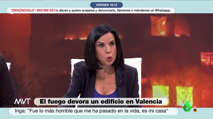 Inga Khachatryan es una vecina del edificio que se ha quemado Valencia y ha visto arder todas sus pertenencias. "¿Qué pasa cuando mi casa arde?", plantea a la abogada Beatriz de Vicente, que responde desde el plató que "el seguir con el pago de la hipoteca va a depender de cada caso". Por el momento, le recomienda que acuda a Mapfre, que es la aseguradora del edificio, porque "están asegurando todo el continente".