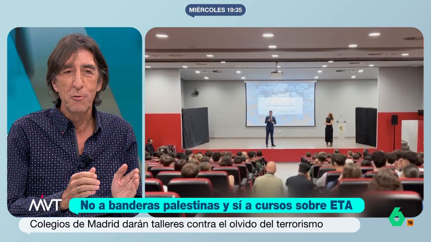 El debate, como señala Cristina Pardo, estaría si en la Comunidad de Madrid hay "un doble rasero" cuando no se permite que esté Gaza presente en los centros públicos "porque es politizar las aulas" y, en cambio, "sí llevar cursos sobre ETA".
