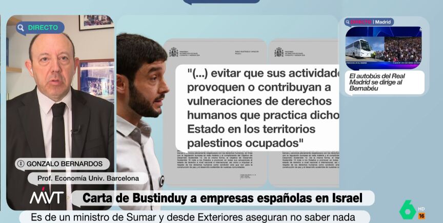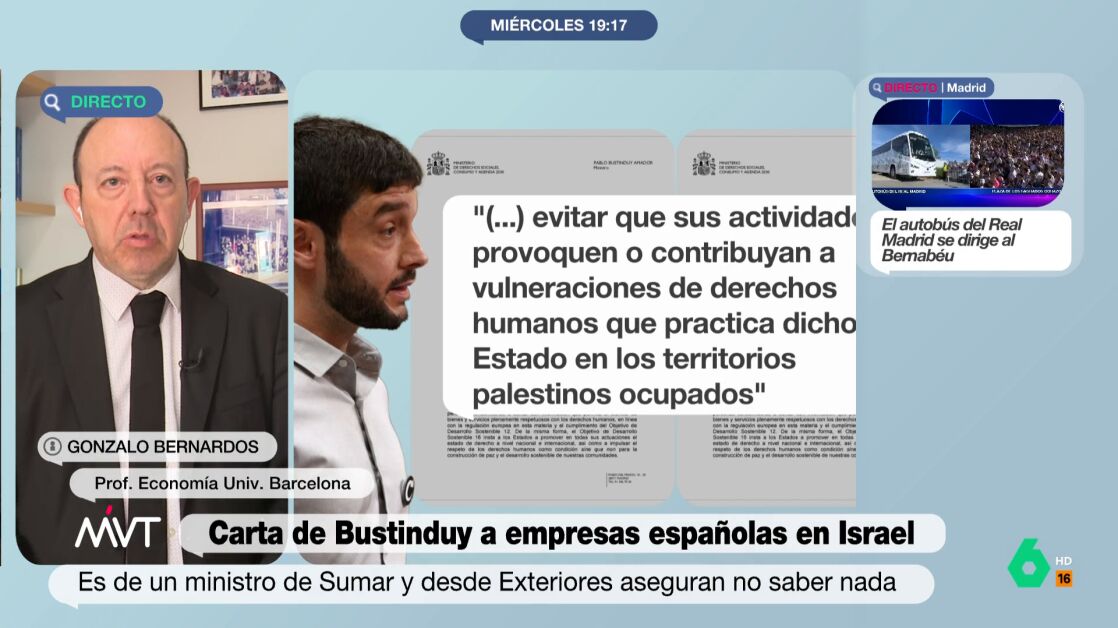 El profesor de Economía de la Universidad de Barcelona, Gonzalo Bernardos, ha valorado este miércoles en Más Vale Tarde que la carta que ha enviado el ministro de Derechos Sociales, Pablo Bustinduy, a las empresas españolas en Israel es una "metedura de pata". A su vez ha considerado que el ministro de Sumar "ha querido tener un día de gloria y que la población se enterase de que es ministro, porque ha pasado muy desapercibido".