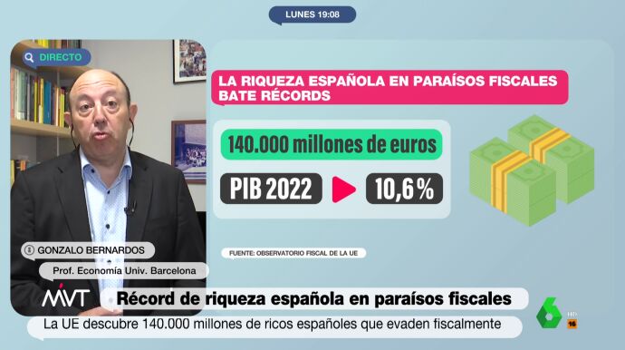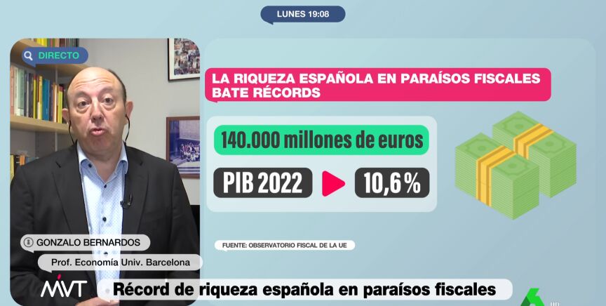 La riqueza española en paraísos fiscales bate récord. La UE ha descubierto que hay 140.000 millones de ricos españoles que evaden fiscalmente. Gonzalo Bernardos apunta que este es un problema frente al que "nadie hace nada".