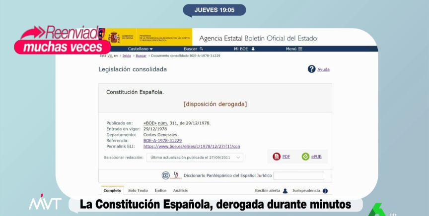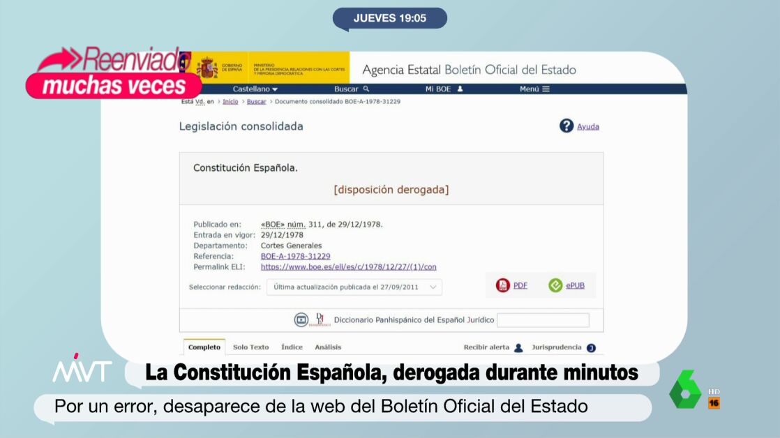 El Boletín Oficial del Estado ha derogado este miércoles durante una media hora la Constitución, el Código Civil y el Código Penal. "¿Os imagináis qué podría haber ocurrido en esos 30 minutos?", han planteado en Más Vale Tarde.