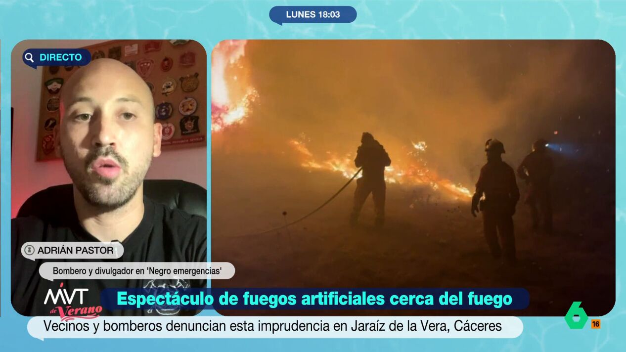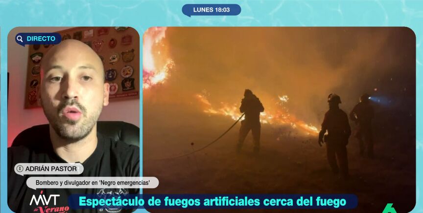 Marina Valdés entrevista a Adrián Pastor, un bombero y divulgador que, mientras estaba combatiendo junto a sus compañeros uno de los muchos incendios activos en este momento en España, vio cómo en la localidad cercana se estaban lanzando fuegos artificiales.