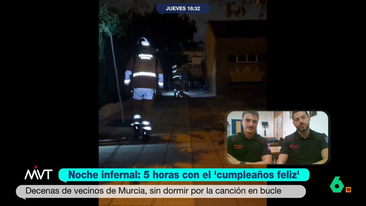 Los Bomberos de Murcia se hacían virales en redes sociales después de haber tenido que acudir a desactivar la megafonía de un centro escolar en la pedanía murciana de Javalí Viejo a través de la que estuvo sonando el 'Cumpleaños Feliz' durante cinco horas. Un total de 132 veces que hizo desesperar a los vecinos. Dos de ellos, José Antonio y Paco, han estado este jueves en Más Vale Tarde para contar los detalles de este no tan peculiar servicio.