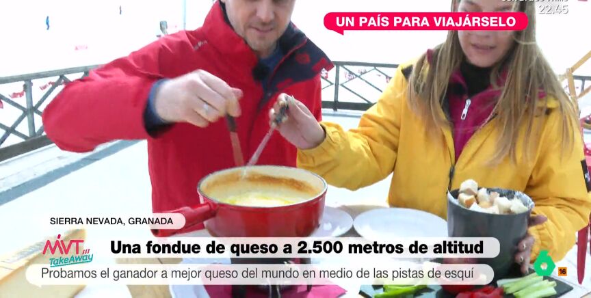 Para comer la fondue, la técnica es sencilla: pinchar pan, untarlo fuerte y remover. Además, Luis llevaba una muestra de este queso a plató, donde Cristina Pardo y Francisco Cacho, que se ofrecía a cambiar la meteorología por ser su sustituto, se deleitaban.