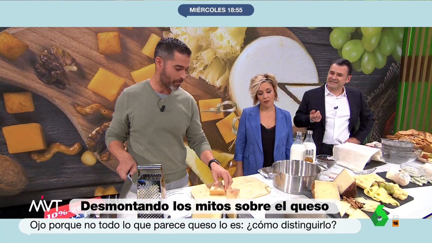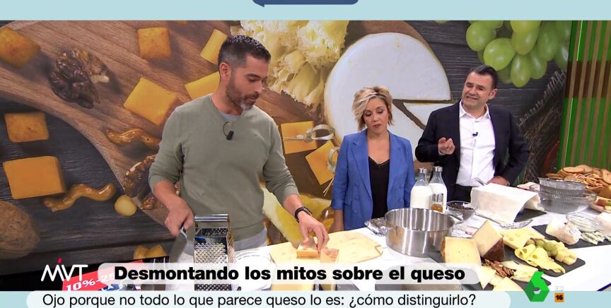 El nutricionista Pablo Ojeda desmonta algunos mitos que rodean al queso. En primer lugar avisa que no todo lo que parece serlo, lo es: "El queso es leche, fermento láctico y sal, apaga y vámonos". Para aprender a distinguirlo, explica que es tan fácil como enfrentar al alimento en cuestión frente a un rallador.