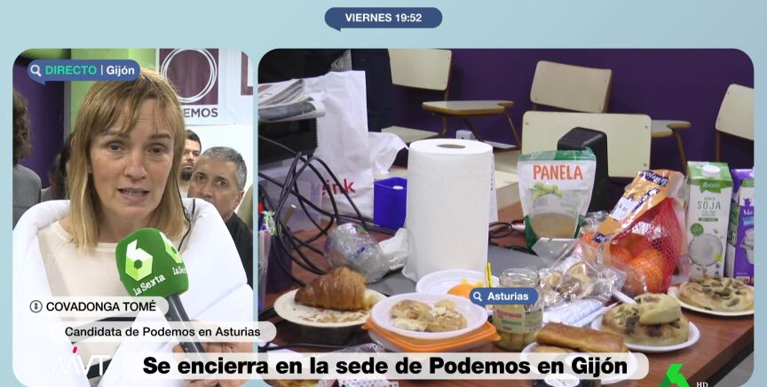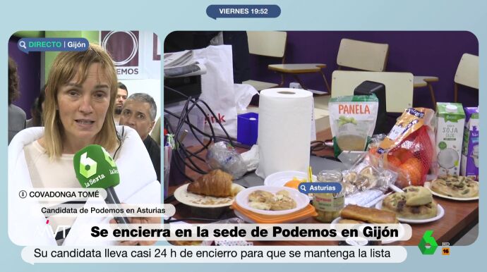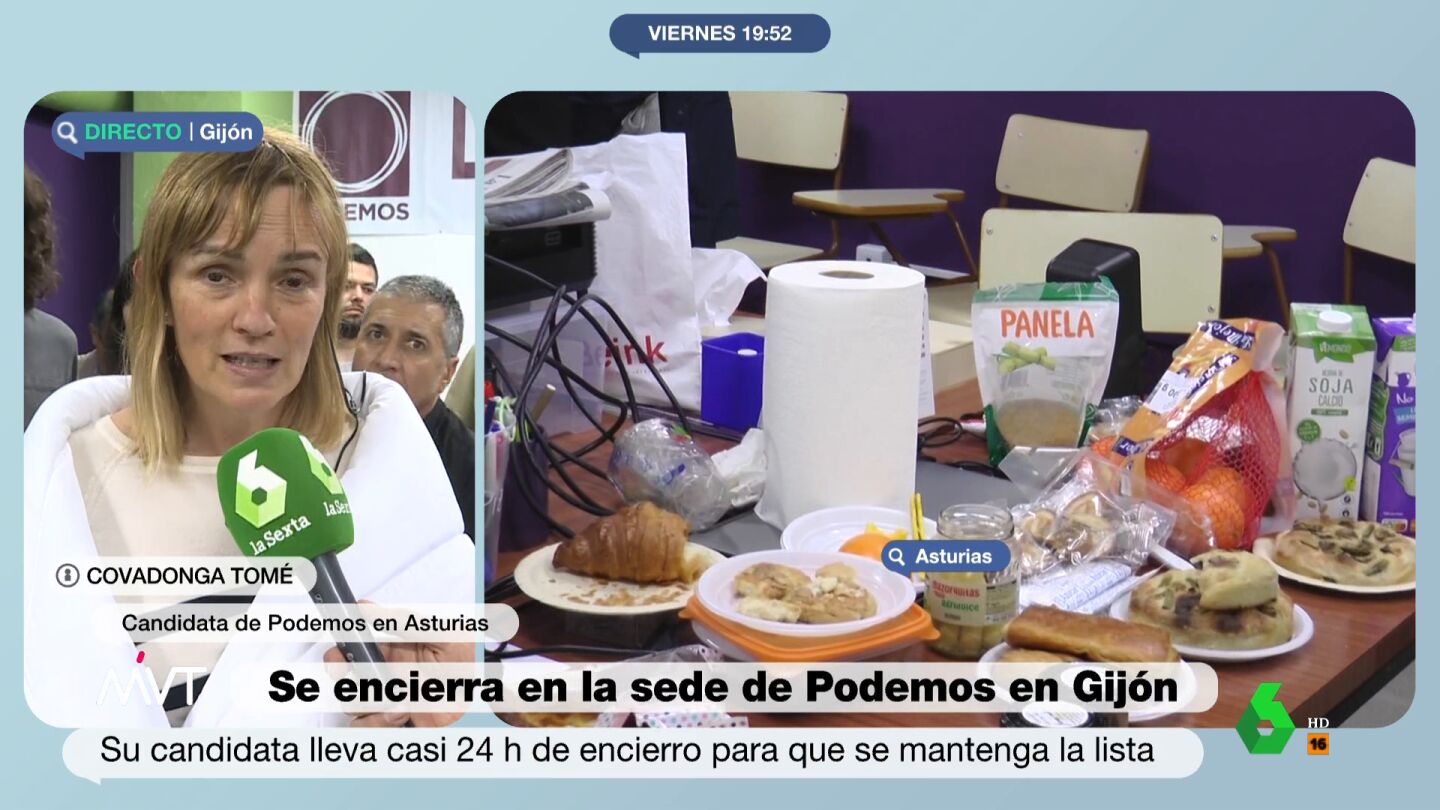 Covadonga Tomé, candidata de Podemos en Asturias, lleva casi 24 horas de encierro en su sede para que se mantenga la lista. La dirección de Podemos quiere cambiar su número cuatro porque, según dicen, está suspendido de afiliación y participación en órganos durante dos años.