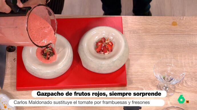 Carlos Maldonado, el chef Estrella Michelin, cocina en Más Vale Tarde gazpacho de frutos rojos, una receta en la que sustituye el tomate por las frambuesas y los fresones. El primer consejo que da es que predomine el tomate, por lo que recomienda echar 100 gramos más de esta hortaliza que de frutos rojos.