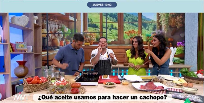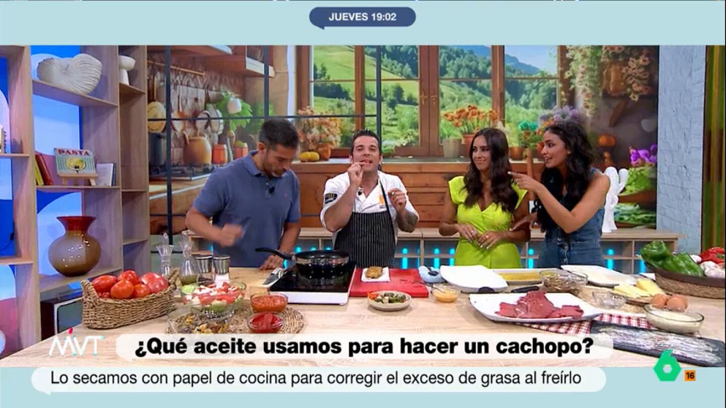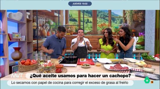 Aprovechando el momento en que la fritura ya está lista y, según María Lamela, "suena como las cataratas del Niágara", el chef desvela un sencillo truco de oído para saber cuándo el cachopo, o también las croquetas, están listos: "Cuando empiezan a llorar, a chisporrotear de una forma más excesiva".