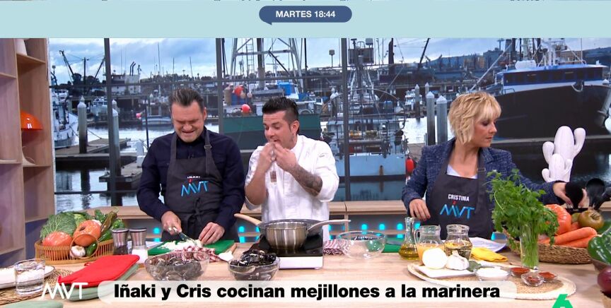 Las clases de cocina de Iñaki López y Cristina Pardo con el chef con estrella Michelin Carlos Maldonado arrancan este 2025 con un plato con aroma a chiringuito y playa: unos mejillones a la marinera.