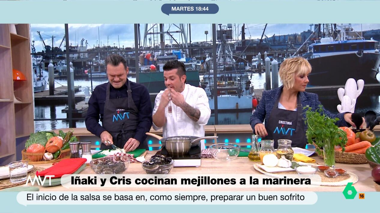 Carlos Maldonado enseña a Cristina Pardo e Iñaki López a cocinar unos mejillones a la marinera y, en este vídeo, aprovecha la elaboración del sofrito para explicar por qué lloramos cuando cortamos cebolla.